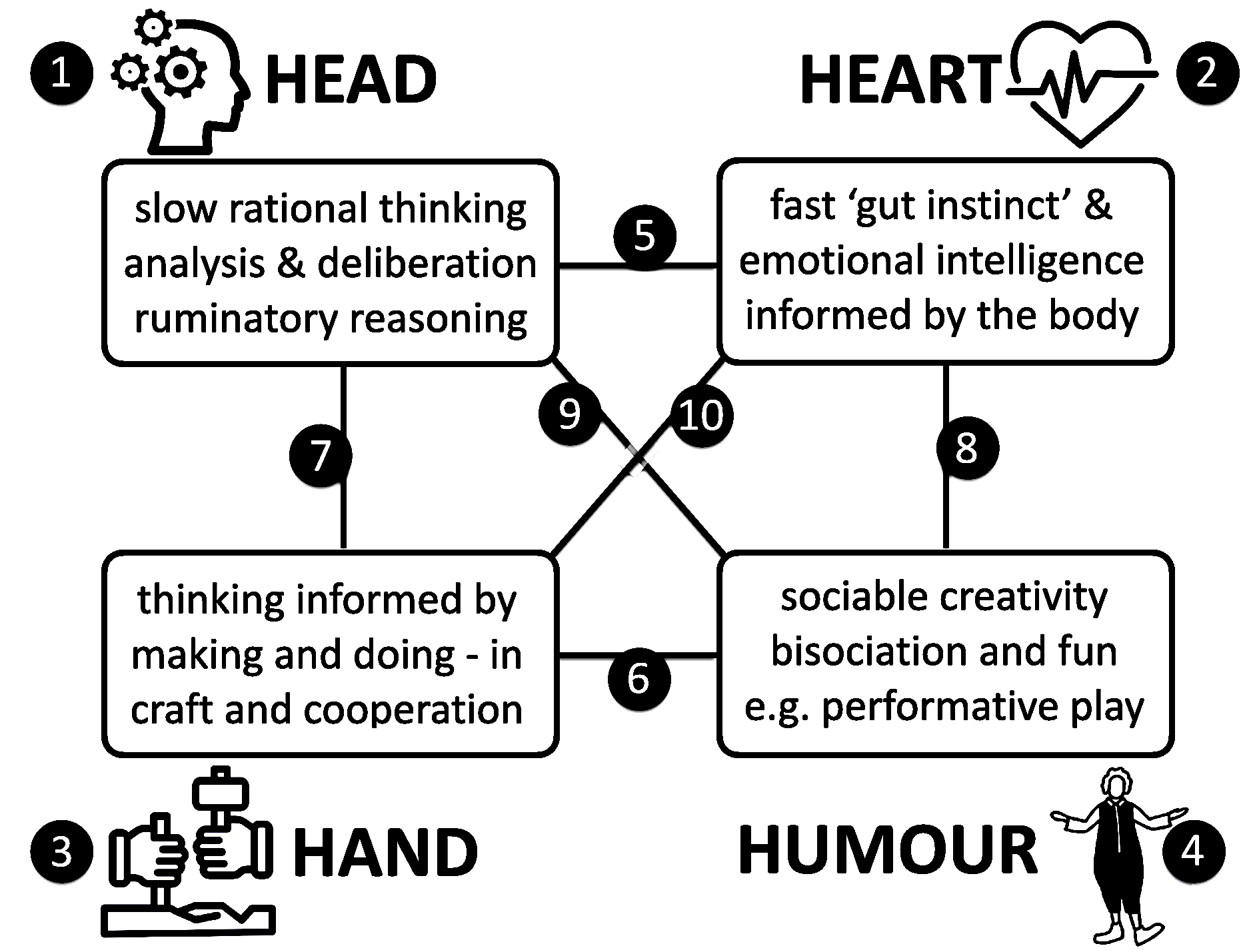 In reimagining the Art School, I have made a sketch that denotes four modes of ‘reasoning’. This might be used as a template for new academic departments or faculties. Together, they act as a very rudimentary map of the sites of human thinking, knowing and practising that represent the virtues of the Art School tradition. The tetrahedral structure reminds us that the four themes are offered in no special order. Indeed, the four nodes of the tetrahedron (Head, Heart, Hand and Humour) are interconnected by their six defining relationships. This is an idea under development, so I will not say more, except to explain that the idea of ‘Humour’ was chosen because it sits at the very nexus of the creative act, or what Arthur Koestler (1964) called ‘bisociation’. In his theory, creativity derives from a combinatorial process that sometimes delivers novel outcomes and, or, spontaneous laughter.
