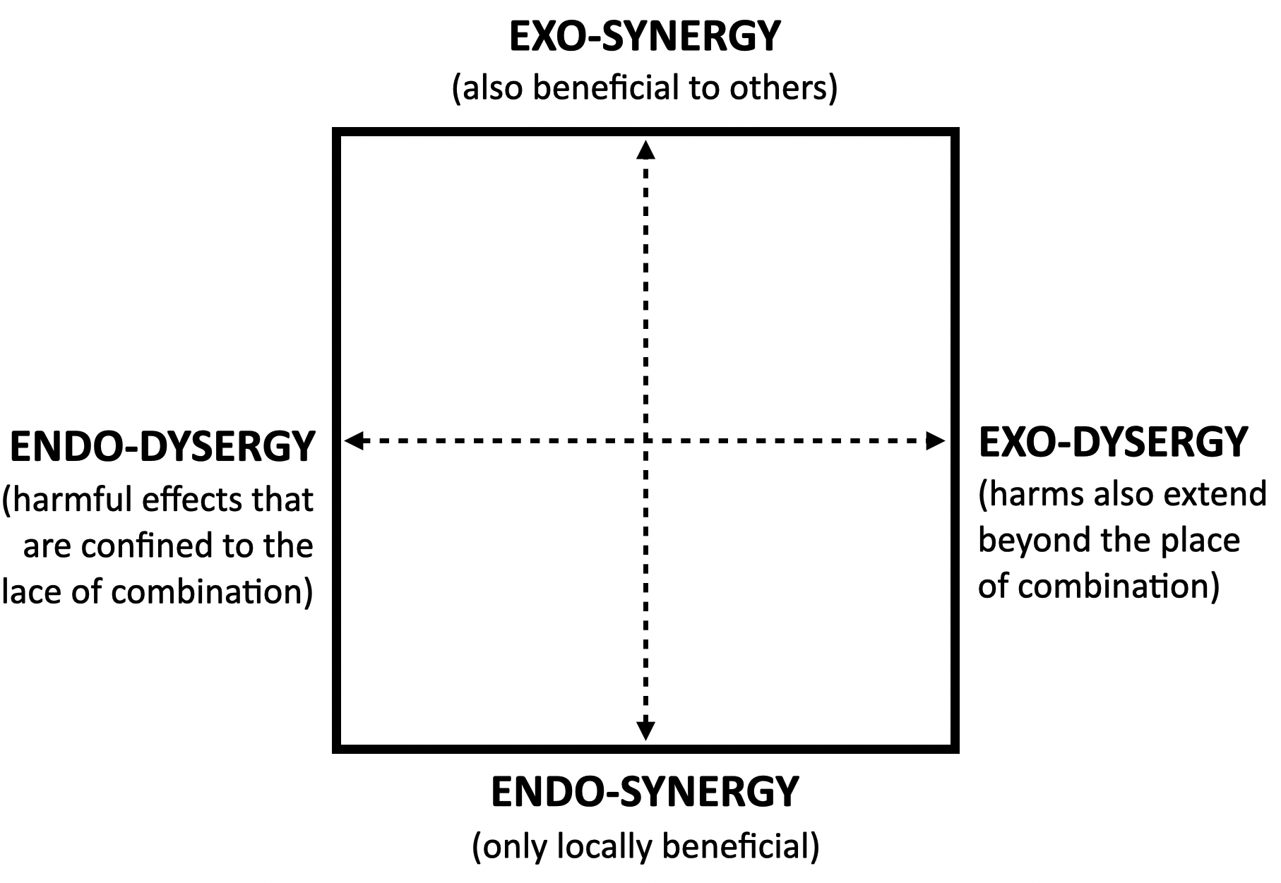 (see 'endodysergy', 'exosynergy'). Whereas 'endodysergy' refers to a dysergy in which the bad effects are confined to the local space of combination, 'exodysergies' also exert a bad influence on external agents or factors.