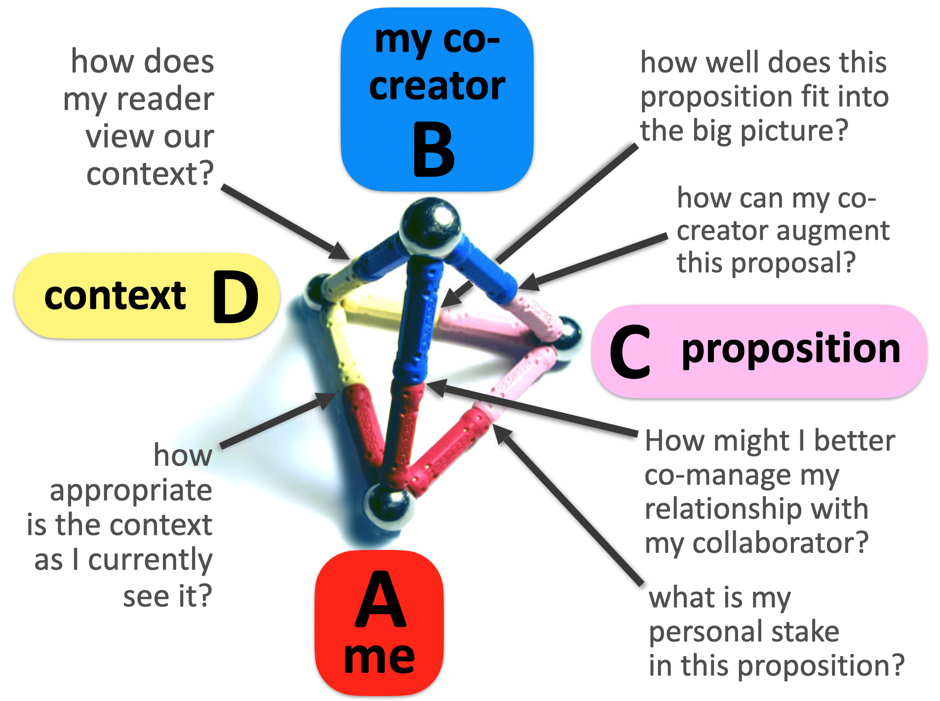 (see 'context' and exo-synergy'). Most acts of creation and co-creation are defined, shaped and judged within their context. This includes an assumed purpose and other elements within the larger situation. Although, the precise purpose and client may initially be unknown or ambiguous, it can be useful to try to map them out in a way that reveals possible unforeseen relationships, their affordances and opportunities. Figure 2 maps a tetrahedral set of relations from the perspective of a co-creator.