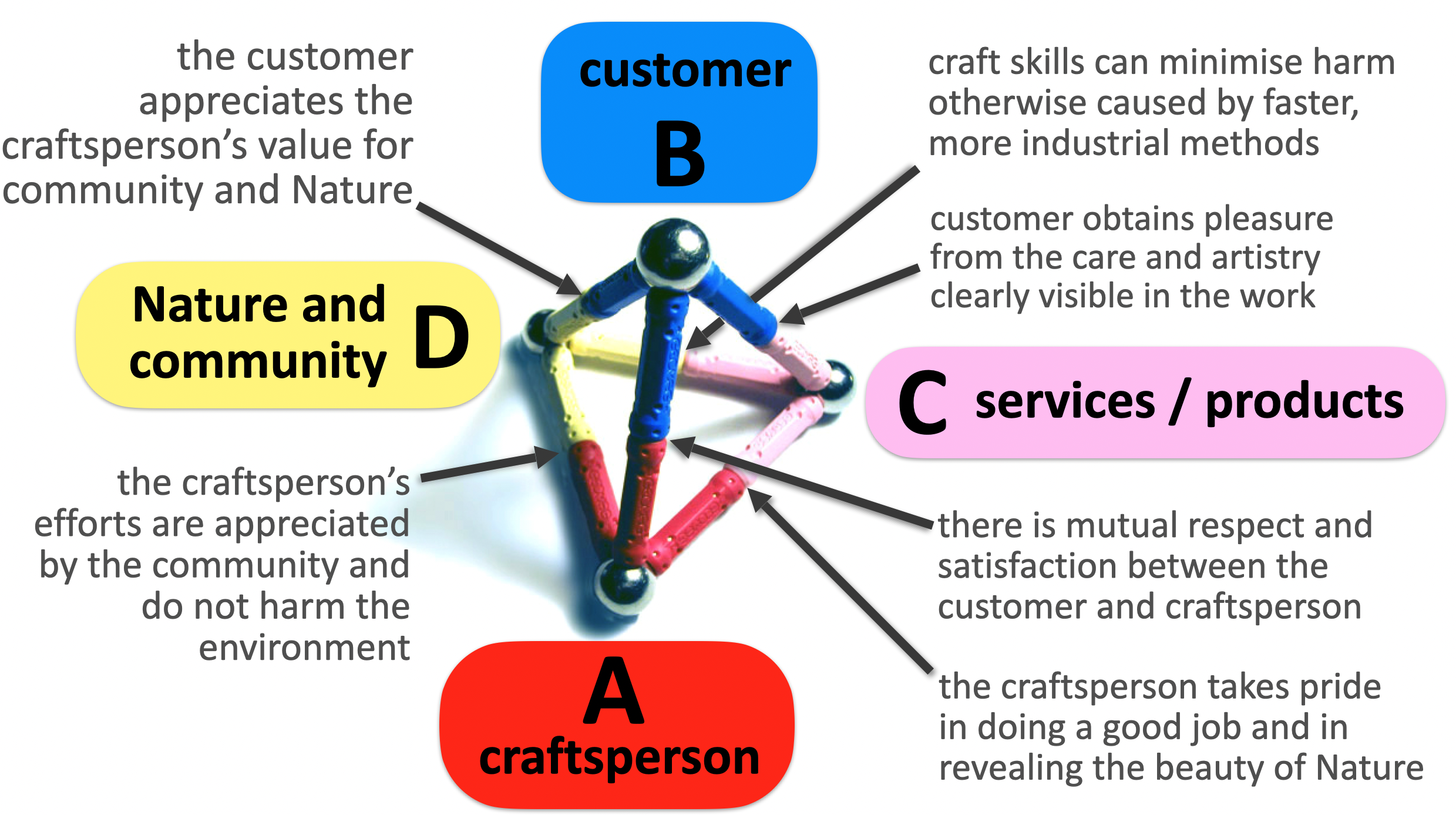 As explained (see 'exo-synergy') the four-fold (i.e. tetrahedral) format is auspicious for reasons that are both cognitive and mathematical. Figure 3 is a diagram that loosely interprets John Ruskin's (1819–1900) writings about the multiple benefits of the craft culture. Unlike figure 2 it presents it as an overview, rather than from the standpoint of one of the agents. It happens to illustrate the fact that four agents have six potential relations that may each be valued somewhere between synergistic or dysergistic. In this case, all can be seen to be exo-synergistic.