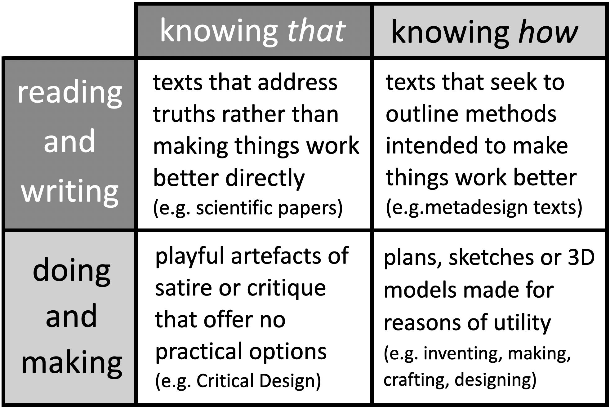 (see 'body-mind dualism', 'exo-synergy', 'search' and 'research'). There are several reasons why art schools (in the UK, at least), were always a dubious addition to mainstream universities. First, they evolved from the mediaeval Crafts Guilds rather than from the monastic traditions of discursive inquiry. Subjects such as fine art, design and craft therefore continue to foreground tacit aspects of knowing, rather than those of reading and writing. Perhaps the growing appreciation of neurodiversities will lead to an education system that is deliberately heterogeneous and co-creative. Currently, academia straddles a fault-line separating two approaches to co-creation. Whereas mainstream education's concern with 'critical thinking' reflects the cloistered scholastism of the ancient monasteries, art schools emerged from the more 'hands-on' methods of the mediaeval Crafts Guilds. It would be good to unify these, and other, approaches in a more comprehensive education system. Fig. 6 proposes 4 domains learning and knowledge as a suggested map of the breadth.